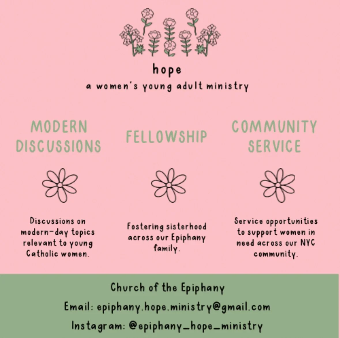 Hope Ministry will serve to empower our young adult women to explore what it means to be and support women in the Catholic Church. We will offer bi-monthly discussions on relevant topics, creating a space to share personal stories and opinions. Further, we will work together to build an “Empire of Hope” (Mother Cabrini) by offering service opportunities to support women and mothers in need across our NYC community.