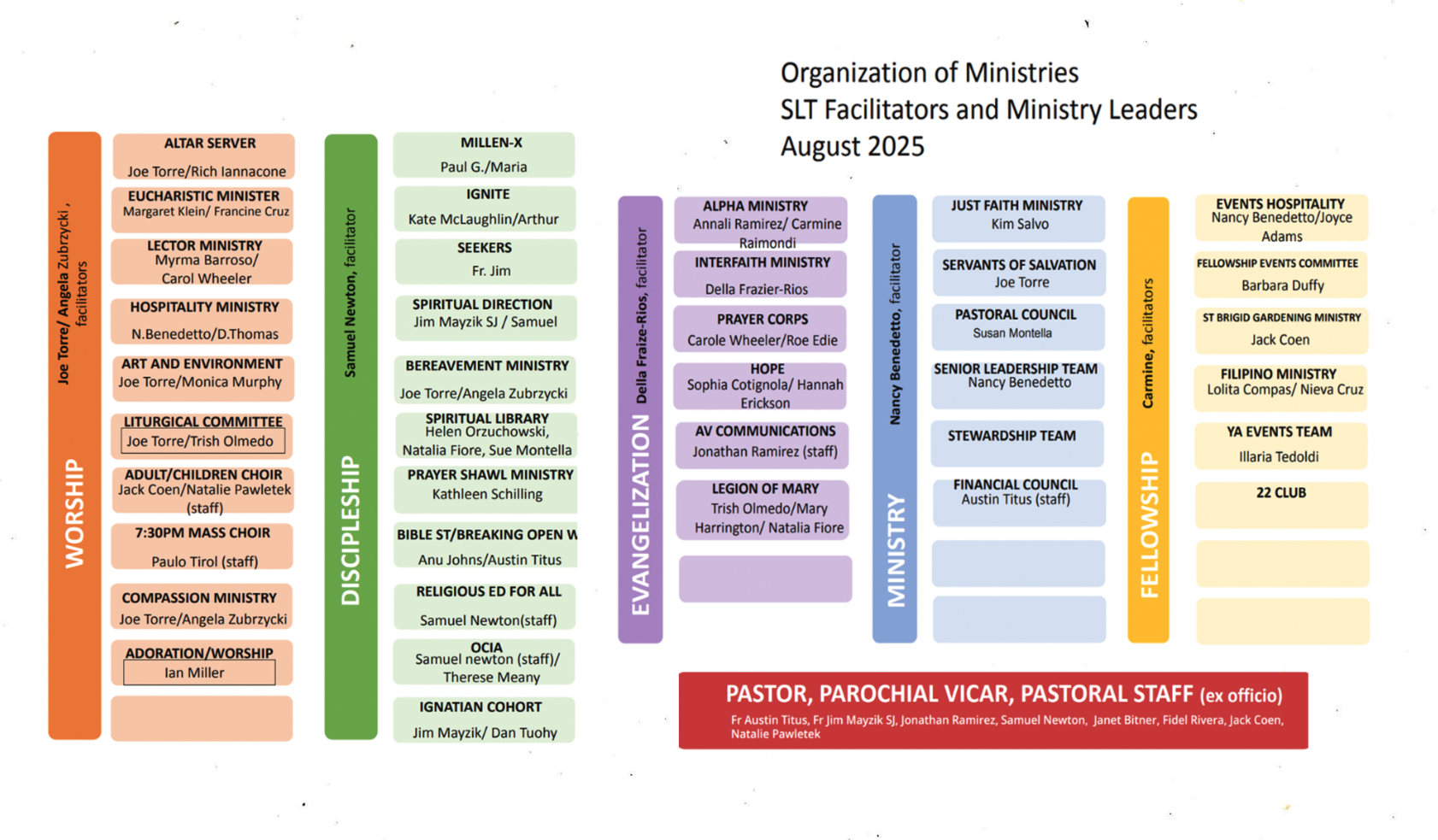 The Staff Team (including Pastor and Associates, Communication Director, Director of Faith Formation and Mission, and others) which supports our sacramental and growing missionary activities and life in the parish.