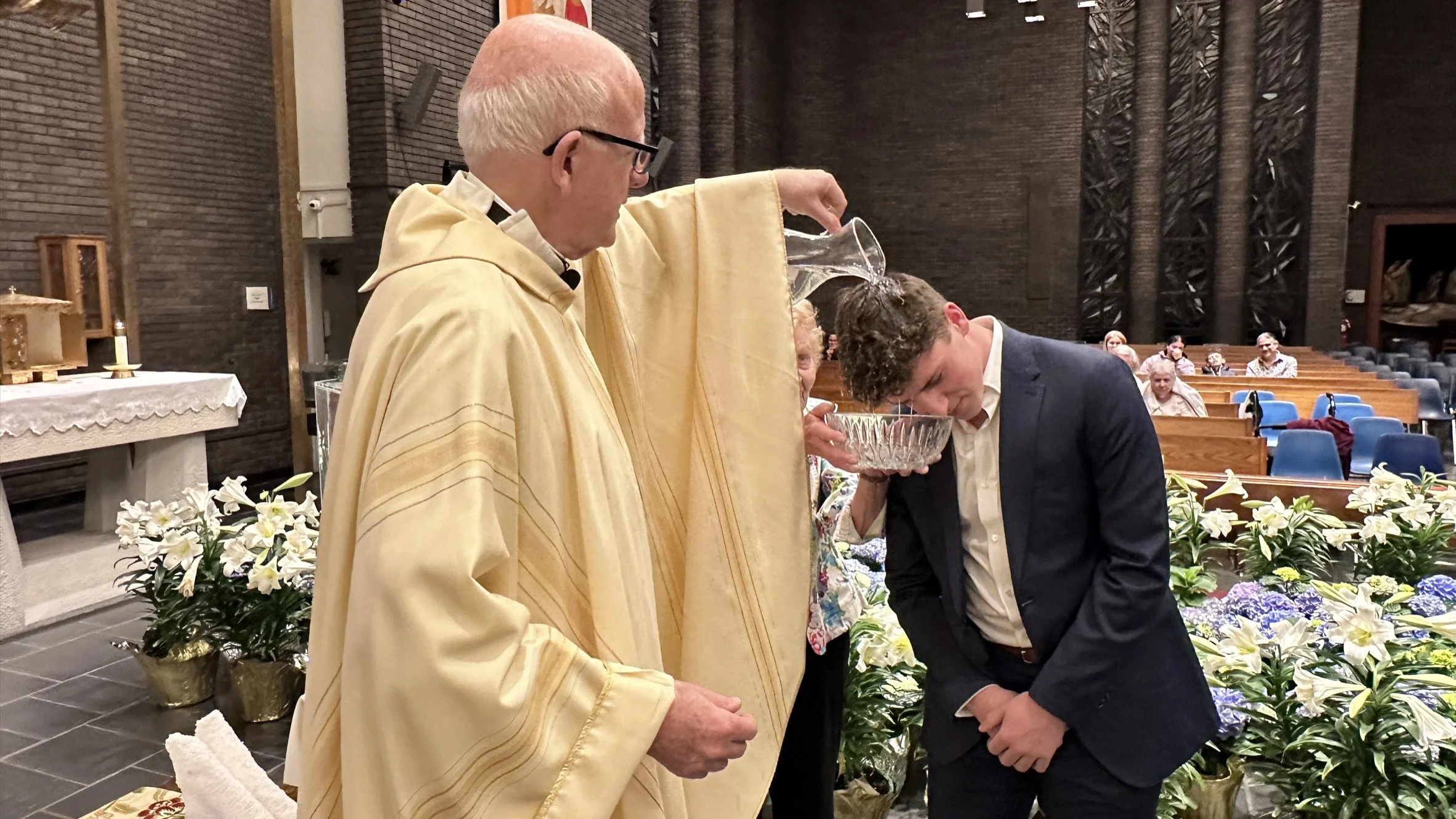 The family is then invited to the baptismal font. Everyone present at the font is invited to make a profession of faith and reject evil. The parents and godparents make this profession on behalf of the child and promise to provide for the child’s religious formation. The celebrant blesses the water with a prayer. Then a parent is asked to hold the child over the baptismal water font as the celebrant says, “[Child’s name] I baptize you in the name of the Father, and of the Son, and of the Holy Spirit.” All present respond “Amen.” At the threefold prayer, the celebrant three times pours water over the child’s forehead. The ritual of immersion or washing helps us understand that our sins are buried and washed away as we die with Jesus, and we are filled with divine light and life as we rise from immersion in the water or are cleaned by the pouring.