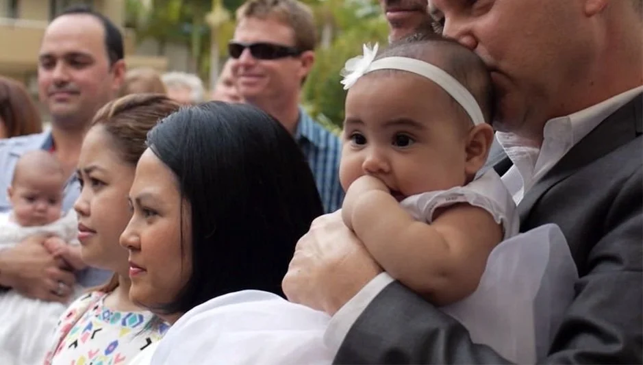 After the anointing with chrism the child is given a white garment, a symbol that the child is clothed in Christ’s protective love. A lit candle is given to the child’s family to remind the child and all of us that as baptized people, we are to be lights for our world. The baptism concludes with the assembled family and friends praying the Our Father, followed by a final blessing. Then, photographs of everyone around the baptismal font!